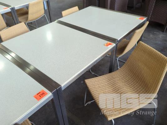 OUTDOOR TABLE - ACRYLIC FAUX STONE TOP, POLISHED STAINLESS LOOK SQUARE TUBE SIDES, FRAME & LEGS. 90 X 75 X 74 CM (W D H) 2 X RATTAN CHAIRS - PE RATTAN, WHEAT COLOUR, POLISHED STAINLESS LOOK FRAME & LEGS, STACKABLE.
