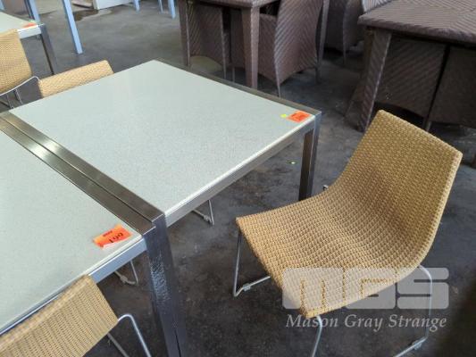 OUTDOOR TABLE - ACRYLIC FAUX STONE TOP, POLISHED STAINLESS LOOK SQUARE TUBE SIDES, FRAME & LEGS. 90 X 75 X 74 CM (W D H) 2 X RATTAN CHAIRS - PE RATTAN, WHEAT COLOUR, POLISHED STAINLESS LOOK FRAME & LEGS, STACKABLE.