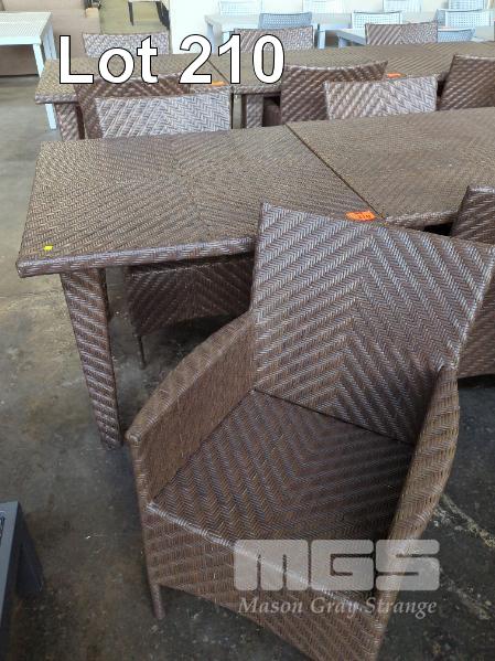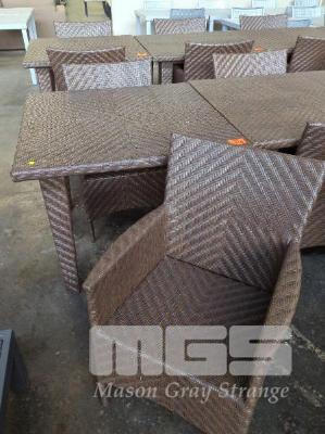 RATTAN OUTDOOR TABLE - PE RATTAN CONSTRUCTION, CHOCOLATE BROWN COLOUR. 95 X 95 X 77 CM (W D H) 2 X MATCHING RATTAN OUTDOOR CHAIRS - HIGH BACK ARMCHAIRS.