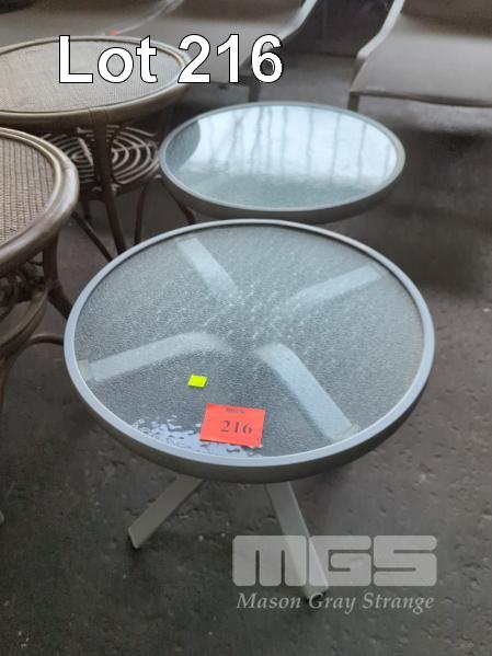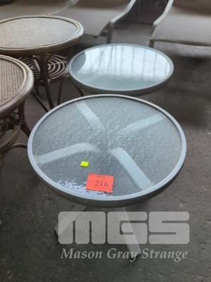 2 X ROUND SIDE TABLES - CLEAR TOPS, COATED ALUMINIUM FRAME & LEGS IN LIGHT GREY. 52 X 47 CM (DIA. H)