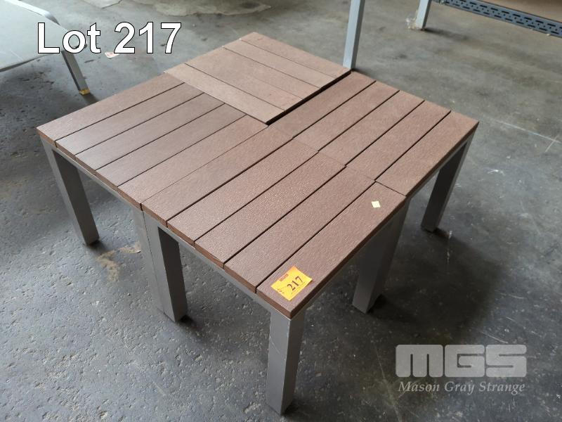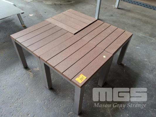 4 X SIDE TABLES - FAUX TIMBER DECKING LOOK, COATED SQUARE TUBE STEEL FRAME. 45 X 45 X 46 CM (W D H) * TOP BOARDS LOOSE ON TWO *