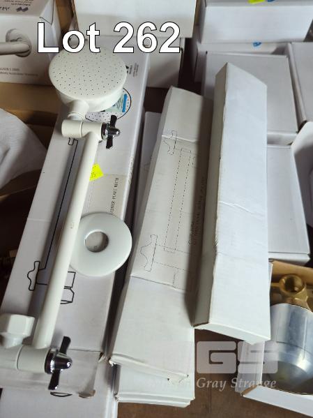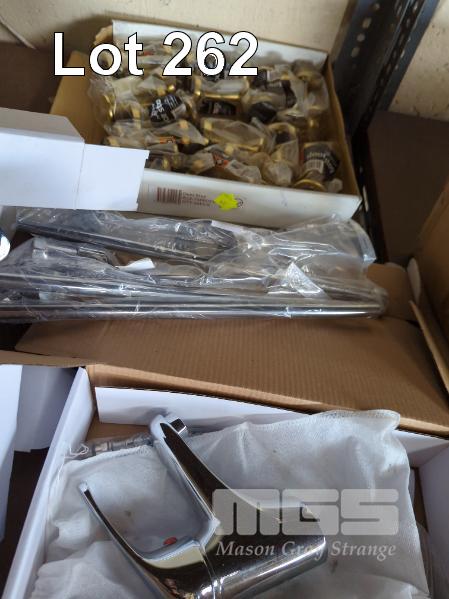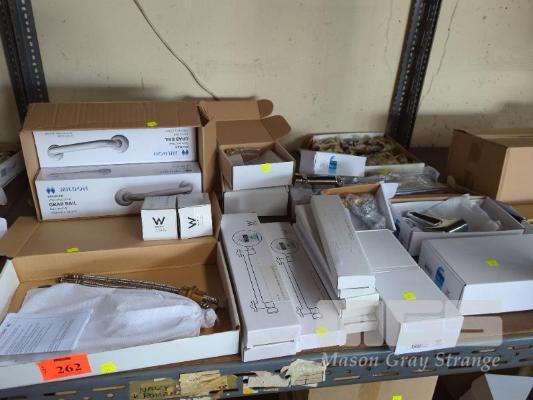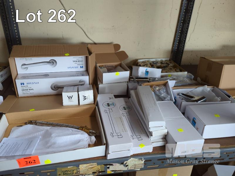 BATHROOM TAP & HARDWARE INCLUDING 3 x BASIN/BATH MIXER TAPS, 6 x SHOWER HEADS, 3 x SHOWER MIXERS, 2 x BASIN MIXERS, 4 x GRAB RAILS, DOOR STOPS, ETC, 1 x SHELF