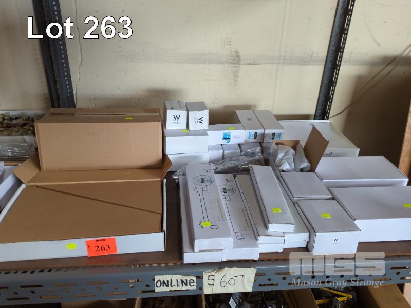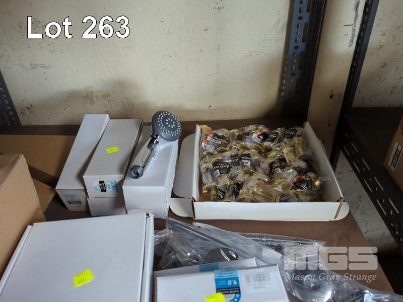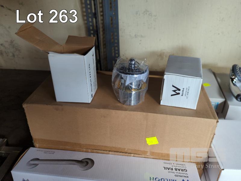 BATHROOM TAP & HARDWARE INCLUDING 3 x BASIN/BATH MIXER TAPS, 6 x SHOWER HEADS, 3 x SHOWER MIXERS, 2 x BASIN MIXERS, 4 x GRAB RAILS, DOOR STOPS, ETC, 1 x SHELF