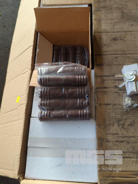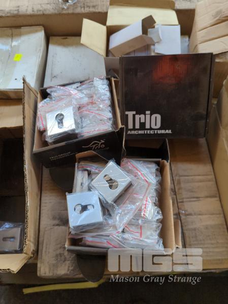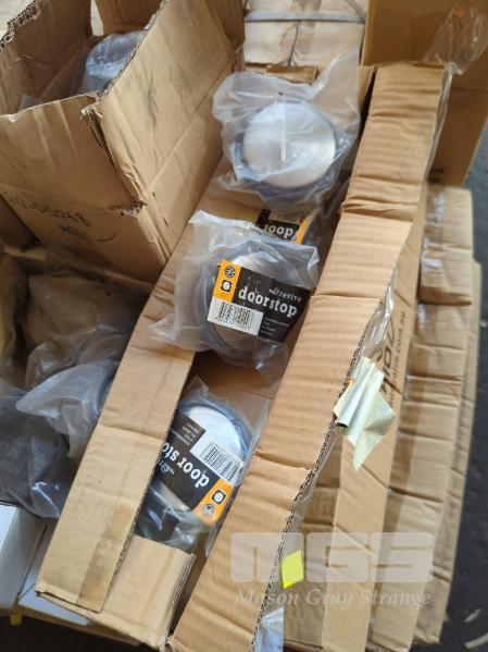 DOOR EXTRAS INCLUDING DOOR STOPS PLASTIC BROWN 10 x BOXES OF 100 EACH, METALLIC DOOR STOPS 6 X BOXES OF 10 EACH, ARCHITECTURAL LOCK TUMBLER KEYS AND ESCUTCHEON SETS 1 x PALLET