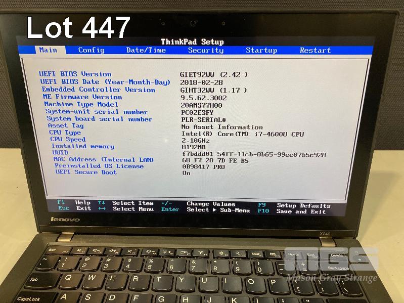 LAPTOP, LENOVO THINKPAD X240, TYPE 20AM, CORE i7 4600U (4TH GEN) @ 2.1GHz, 8GB DDR3 RAM, 512GB SSD, 12.5" TOUCHSCREEN (1920x1080), INTEL HD VIDEO, Wi-Fi, BLUETOOTH, WINDOWS 10 PRO INSTALLED & POWER SUPPLY (NOTE: MARKS ON SCREEN, WHITE SPOT SCREEN BLEMISH) S/N:PC02ESFY