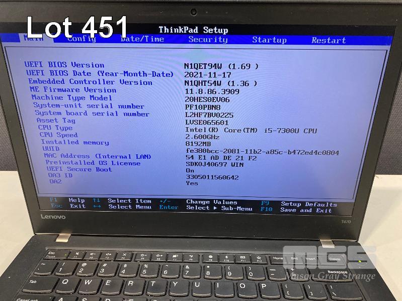 LAPTOP, LENOVO THINKPAD T470, TYPE 20HE, CORE i5 7300U (7TH GEN) @ 2.6GHz, 8GB DDR4 RAM, 256GB NVMe M.2 SSD, 14" WIDESCREEN (1920x1080), INTEL HD VIDEO, Wi-Fi, BLUETOOTH, WINDOWS 10 PRO INSTALLED & POWER SUPPLY (NOTE: MARKS ON SCREEN, DAMAGED USB PORT RHS) S/N:PF10PBN8
