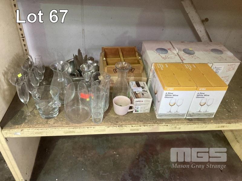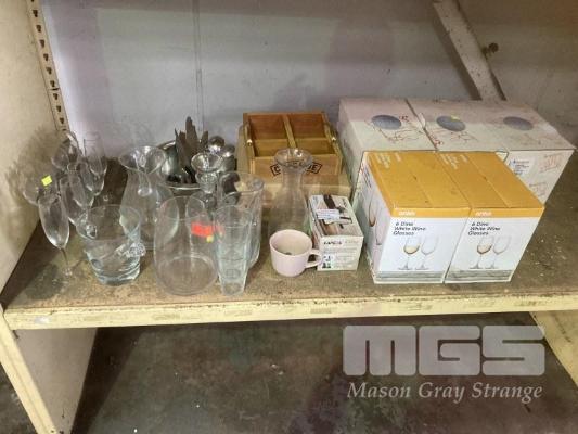 ASSORTED GLASSWARE, COCKTAIL TRAYS, ETC