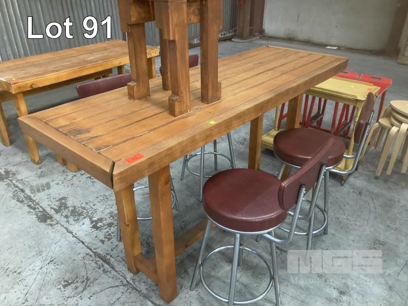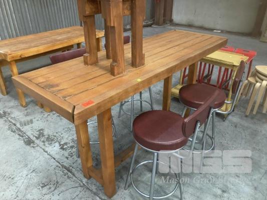 BAR TABLE, 186 x 65cm, TIMBER & 4 x STOOLS