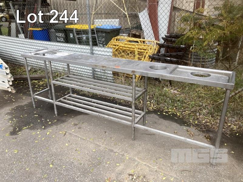 STAINLESS STEEL BENCH, 266 x 45cm, WITH 3 x RUBBISH CHUTES