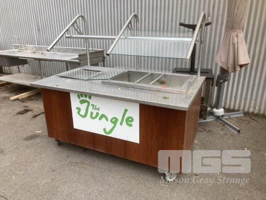 MOBILE HOT & COLD FOOD BAR, 180x 107cm, 24 240V WITH OVERHEAD LIGHTING & SNEEZE COVER (NOTE: 1 x GLASS PANEL DAMAGED)