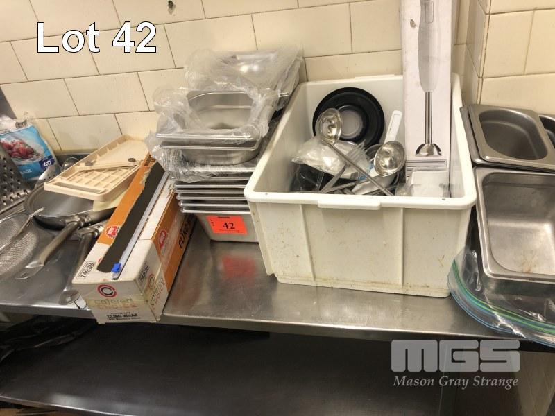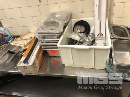 2 x STAINLESS STEEL FRY PANS, 16 x SMALL GASTRONORM TRAYS & ASSORTED KITCHEN UTENSILS