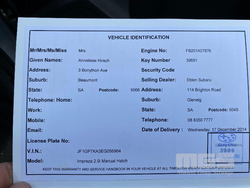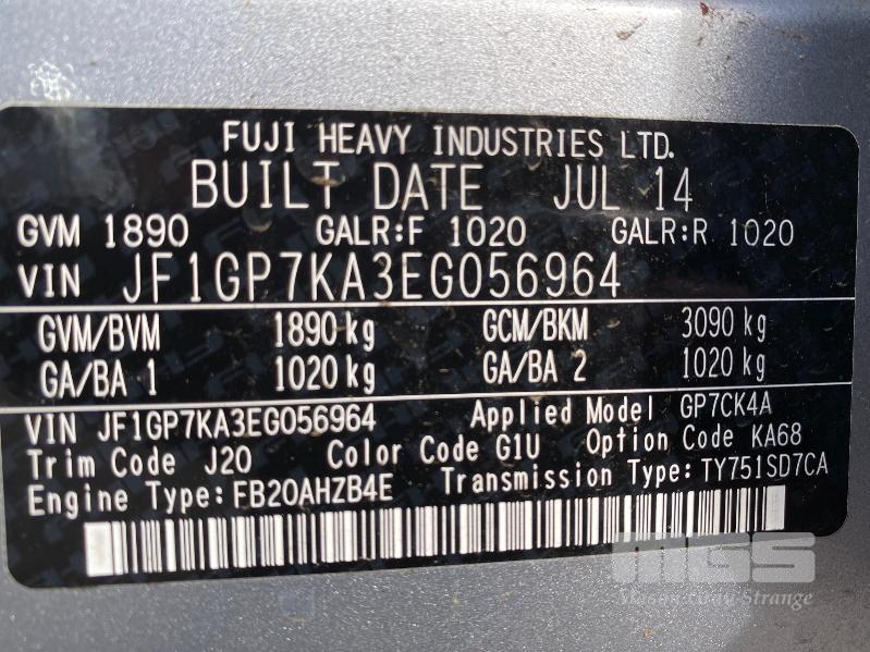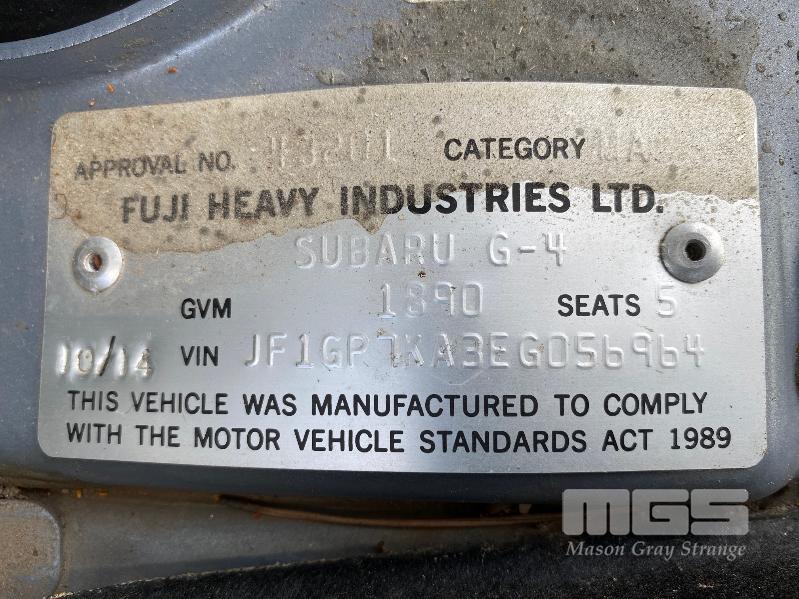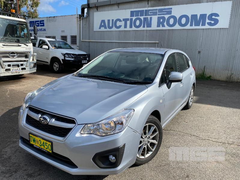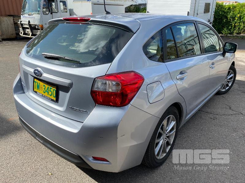 2014 SUBARU IMPREZA G-4 HATCH ALL WHEEL DRIVE REG: TM 34 50 (SA) VIN: JF1GP7KA3EF056964 ENG: FB201427876 ODO: 15,341kms SHOWING 2.0 LITRE, 6 SPEED MANUAL TRANSMISSION, PETROL, SILVER DUCO, 4 DOORS, 5 SEAT, ALL WHEEL DRIVE ABS, AIR BAG, AIR CON, ALLOY WHEELS, BLUETOOTH, CD PLAYER, CRUISE CONTROL, IMMOBILISER, POWER STEERING, POWER WINDOWS, SPARE WHEEL, KEY #23 (WITH PAPERS, WITH 1 KEY/S, WITH OWNER'S MANUAL, WITH SERVICE BOOKS) CONDITION: DUCO - MINOR SCRATCHES & SCRAPES