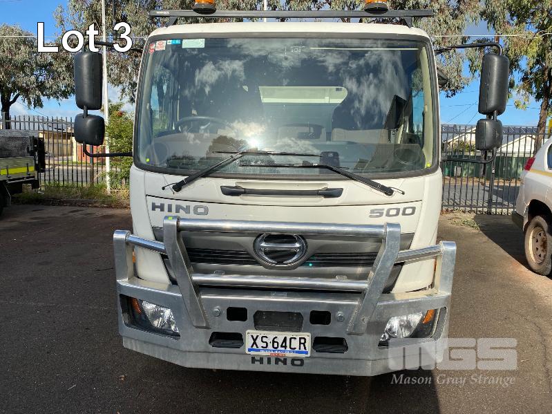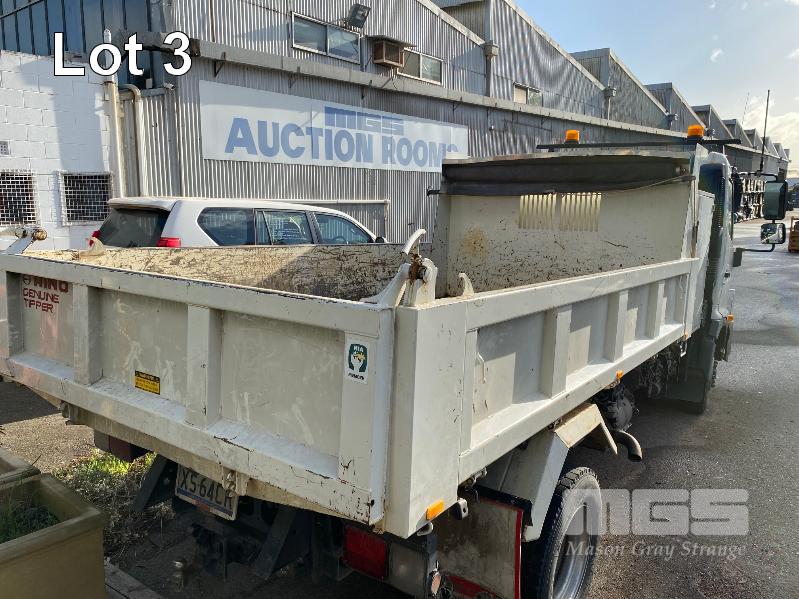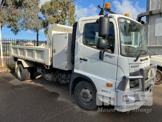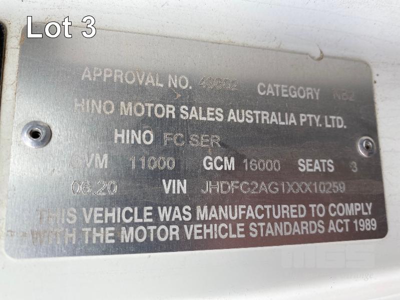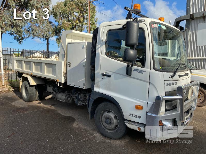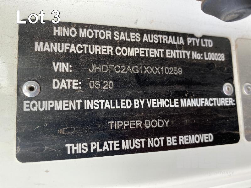 2020 HINO FC 1124, SERIES 500, 4x2 TIPPER TRUCK REG: XS 64 CR VIN: JHDFC2AG1XXX10259 ODO: 38,208kms SHOWING HOURS: 1,470 hours GVM: 11,000kg GCM: 16,000kg 4 CYLINDER TURBO DIESEL, ADBLUE, 6 SPEED MANUAL TRANSMISSION, SPRING SUSPENSION, WHITE DUCO, 2 DOORS, 3 SEAT, AIR CON, CD PLAYER, CB RADIO, BULL BAR, HYDRAULICS, STEEL RIMS, TIPPER HOIST CONTROLS, TOW BALL SAT NAV CRUISE CONTROL ROOF MOUNT HAZARD LIGHTS, BEHIND CAB STORAGE COMPARTMENT SIZE: 700 x 1100(H)mm STEEL TIPPER BODY WITH ROLL OVER TARP, 2 WAY TAILGATE & HINGED SIDES TIPPER BODY SIZE 3600L x 2000W x 500H mm (INTERNAL) KEY #15 (WITH 1 KEY/S, WITH OWNER'S MANUAL, WITH SERVICE BOOKS)