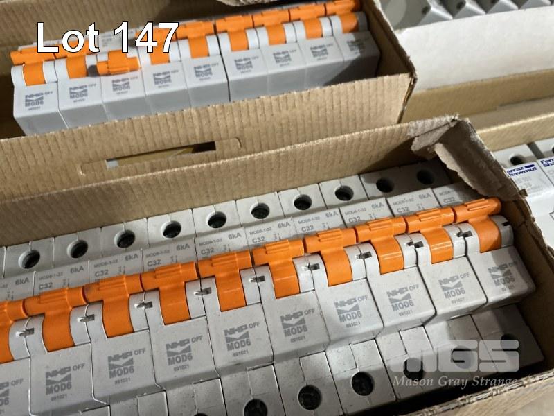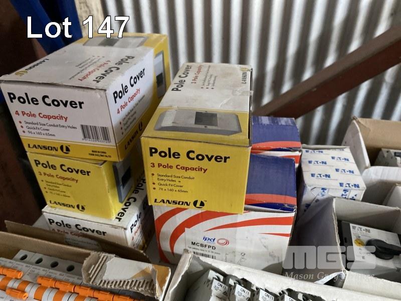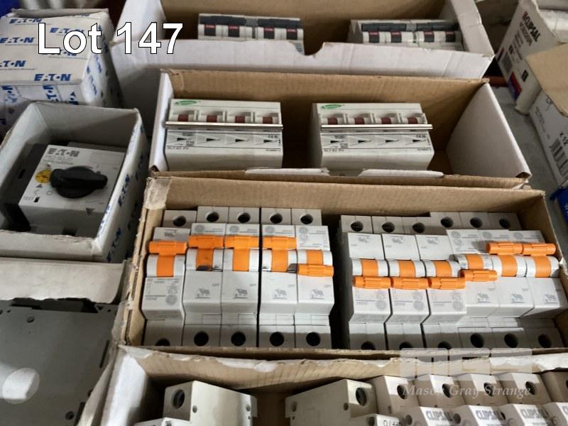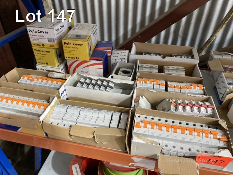 9 x ROLLS ASSORTED CIRCUIT BREAKERS, 6 x BOXES POLY COVERS, ETC
