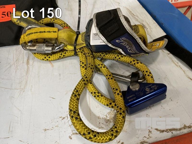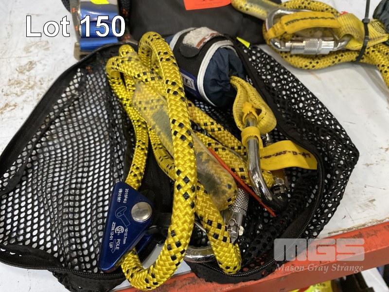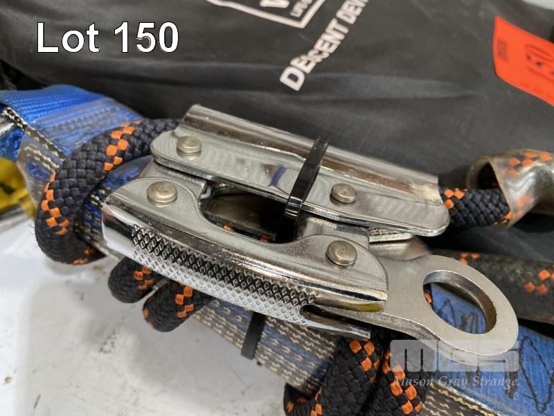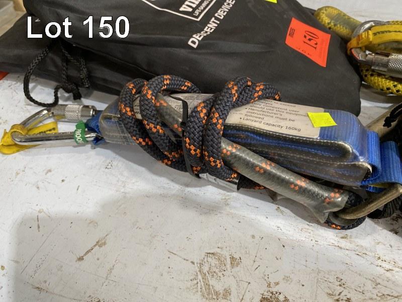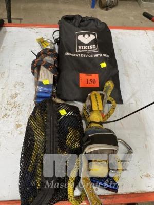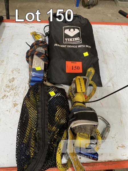 3 x SALA HARNESS SHOCK/FORCE ABSORBER ASSEMBLIES FITTED WITH ROPE LOCK/SELF CLIMBING DEVICES, CARABINERS & 2 x VIKING DESCENT SEATS