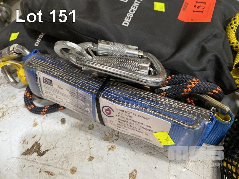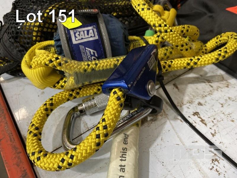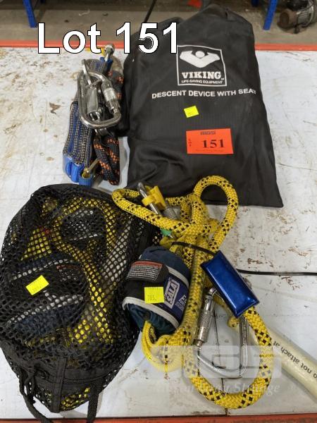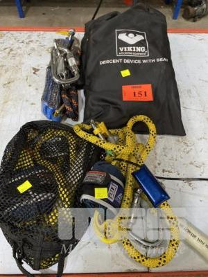 3 x SALA HARNESS SHOCK/FORCE ABSORBER ASSEMBLIES FITTED WITH ROPE LOCK/SELF CLIMBING DEVICES, CARABINERS & 2 x VIKING DESCENT SEATS