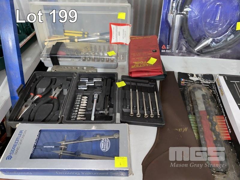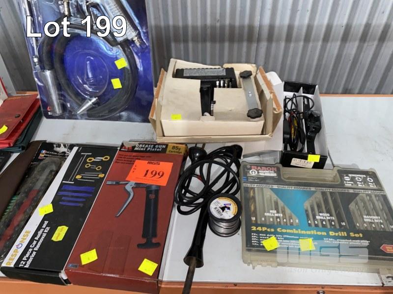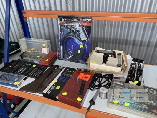 SANDBLASTING GUN & HOSE UNIT, DRILL BIT SET, DRIVER SETS, ALLEN KEYS, MINI GREASE GUN, ASSORTED TOOL MEASUREMENT KITS, ETC