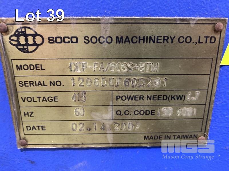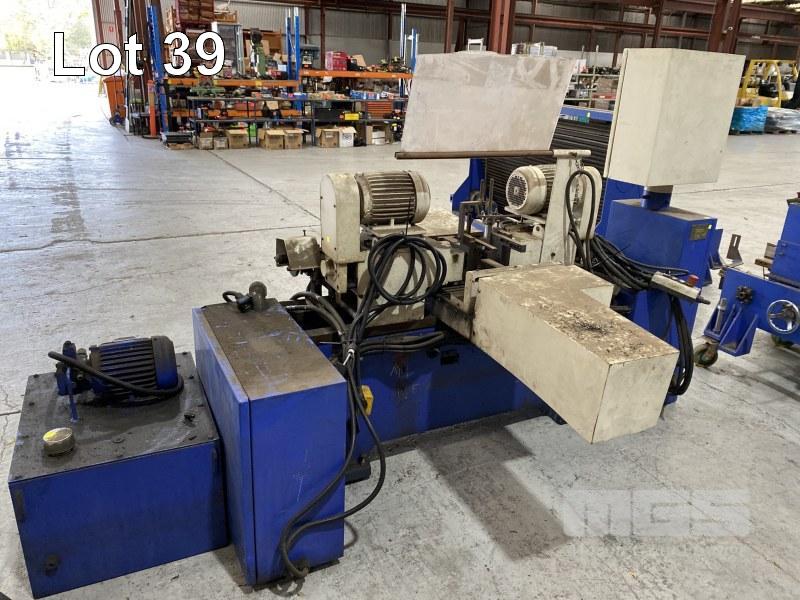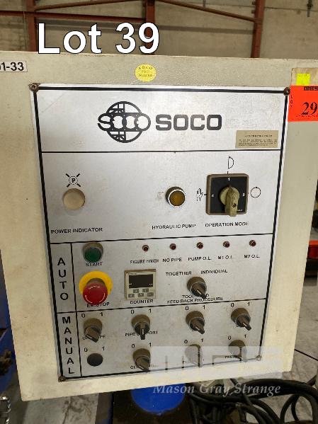 TUBE CHAMFERING MACHINE, SOCO MOD: DEF-FA/60SS+BTM DOM: 2007 WITH AUTO ON PENDANT CONTROL DUAL END CHAMFERING WITH HYDRAULIC POWER UNIT & ELEVATED CONVEYOR UNIT, ROTARY STEEL SLOT/ANGLE FEED 600 (W) TO 1300mm (H), 1400mm (L), 415V, MOBILE WITH ATTACHMENT, ADJUSTABLE WIDTH IN FEED, HEAVY DUTY STEEL CONSTRUCTION