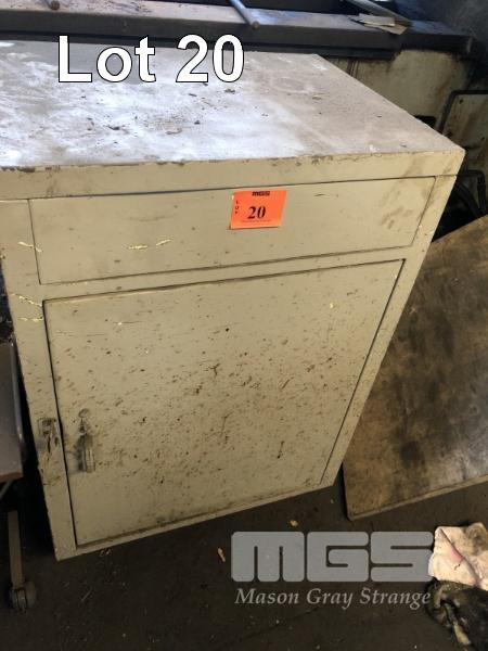 STEEL STOCK CUPBOARD, 1 x DOOR/DRAWER & CONTENTS, ARLEC 12v BATTERY CHARGER & JUMPER LEADS