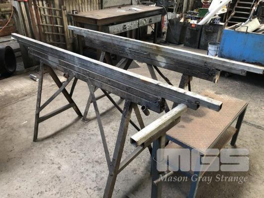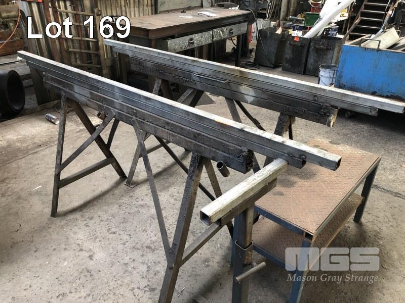2 x STEEL WORK STANDS, 2200mm & SHELF UNIT, 2 TIER, 900 x 400mm