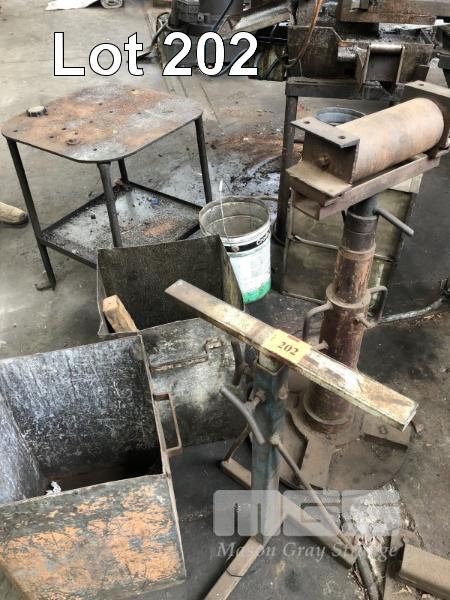 2 x WORK STANDS, ADJUSTABLE HEIGHT, HEAVY DUTY BENCH & WASTE BIN