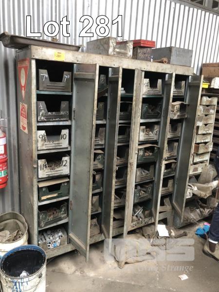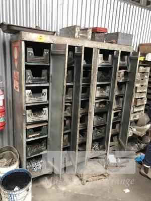 ASSORTED HARDWARE INC NUTS, BOLTS, CAP HEAD BOLTS, CS HEAD SCREWS, TRAILER TAIL GATE LATCHES, METAL SCREWS, 35 x SHELVES, INCLUDES RACK