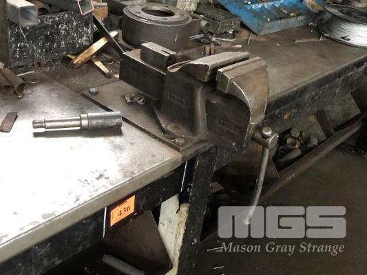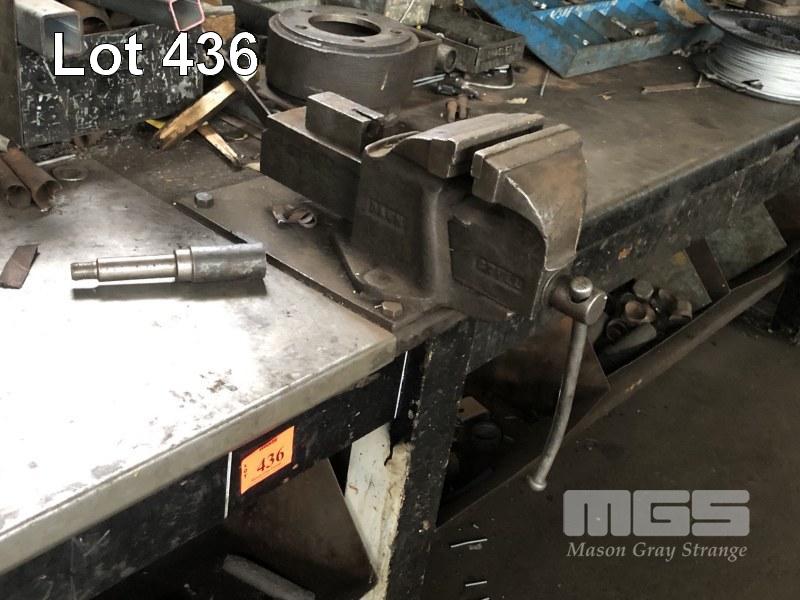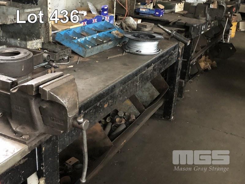 OLD STYLE TIMBER BENCH, SHEET STEEL TOP & 6" VICE, 3700 x 900mm