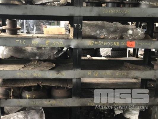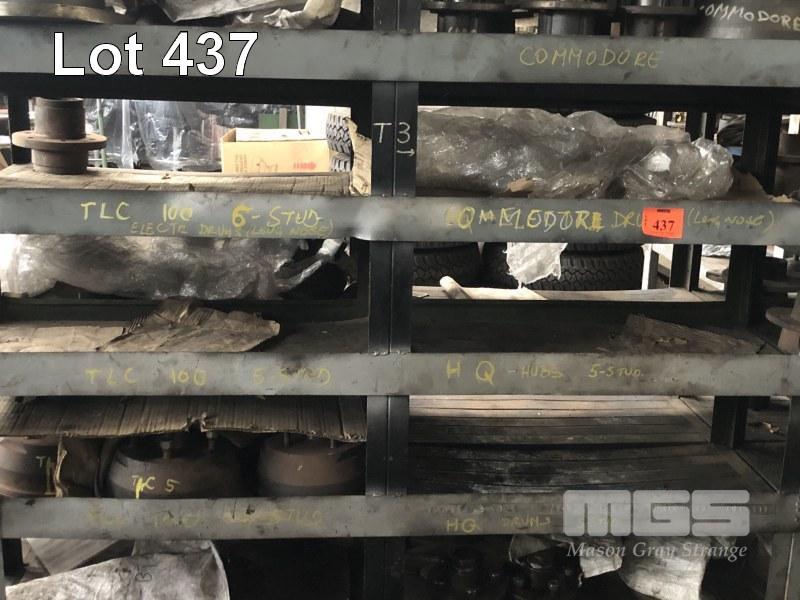 CONTENTS OF DOUBLE SIDED RACK & STORAGE BINS INC VARIOUS HUBS, BRAKE DRUMS & TRAILER PARTS, RACK & BINS INCLUDED, RACK: 2320 x 630 x 1800mm 8 x BINS & RACK: 1200 x 600 x1500mm