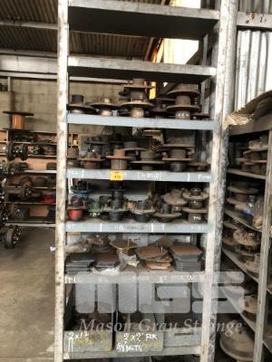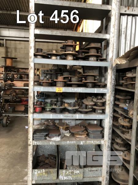 54 (APPROX) x 5 & 6 STUD TRAILER HUBS, 3 x SHELVES & 200 (APPROX) x ASSORTED SHAPES & SIZES FISH PLATES, 3 x SHELVES