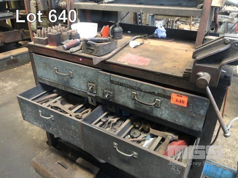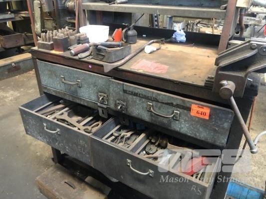 STEEL WORK BENCH, PLATE TOP, 4 DRAWER, 1230 x 600 x 10mm WITH 5" OFFSET VICE & CONTENTS DRAWERS