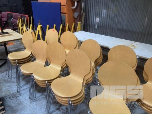 36 x CAFE CHAIRS, ONE PIECE MOULDED TIMBER, CHROME FRAME & 6 ASST TABLES