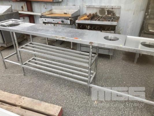 STAINLESS STEEL BENCH, 266 x 45cm, WITH 3 x RUBBISH CHUTES