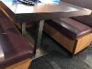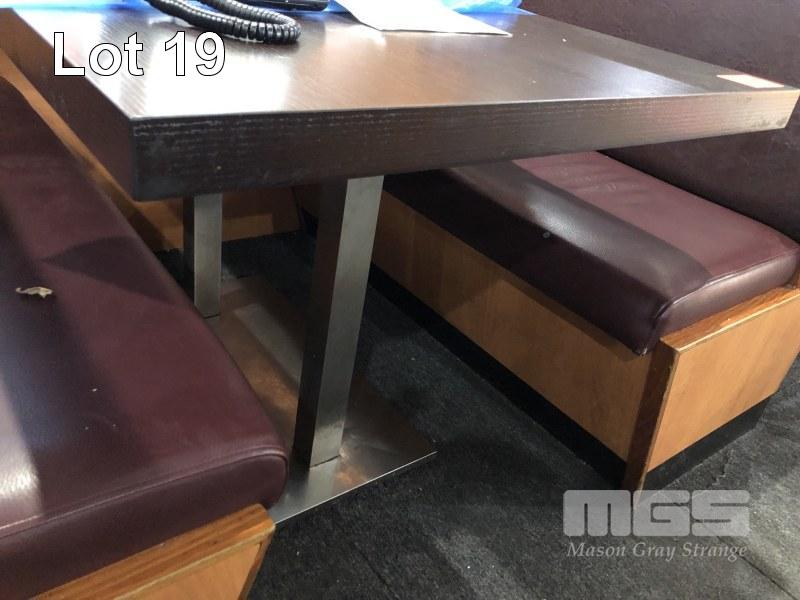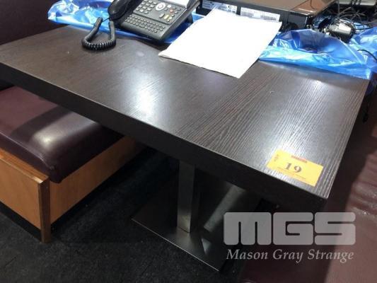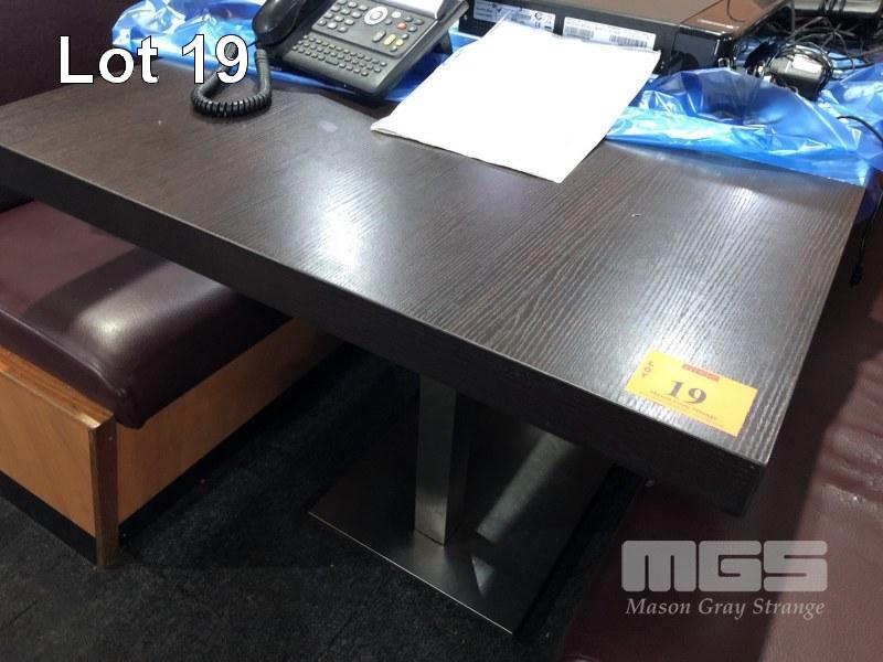 4 x DINING TABLES, ROSEWOOD TIMBER LAMINATE, 1200 x 800 x 50mm TOP, CHROME STEEL, TWIN PEDESTAL PLINTH BASE