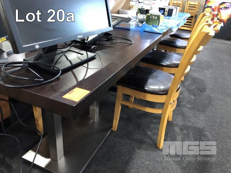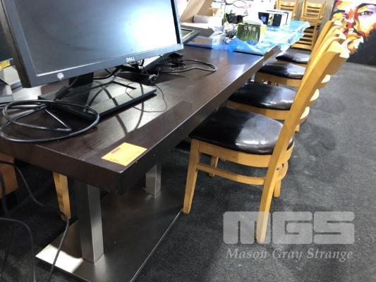 4 x DINING TABLES, ROSEWOOD TIMBER LAMINATE, 1200 x 800 x 50mm TOP, CHROME STEEL, TWIN PEDESTAL PLINTH BASE