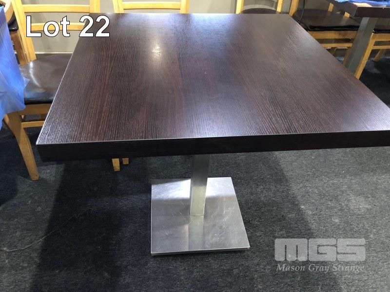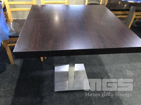 4 x DINING TABLES, ROSEWOOD TIMBER LAMINATE, 820 x 800 x 50mm TOP, CHROME STEEL, SINGLE PEDESTAL BASE