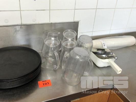 9 x WAITERS TRAYS, 6 x PLASTIC JUGS, 50 PACK DETPAK CUPS & 5 x PRODUCT SCOOPS
