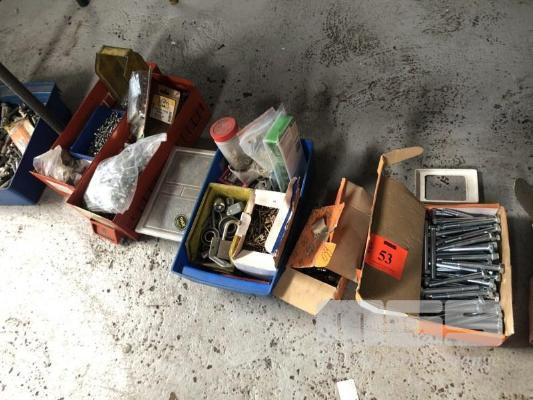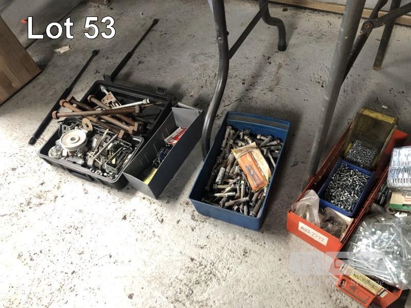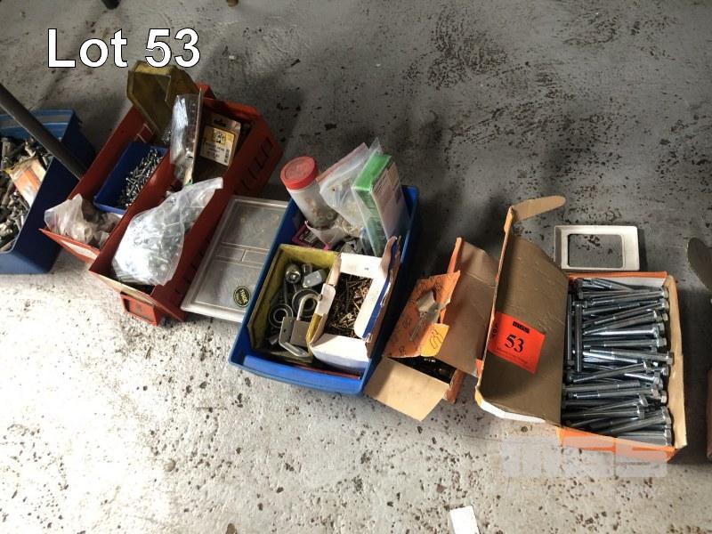 18 (APPROX) TUBS/BOXES ASSORTED HARDWARE, NUTS, BOLTS, SCREWS, WASHERS, DOOR HANDLES & HINGES