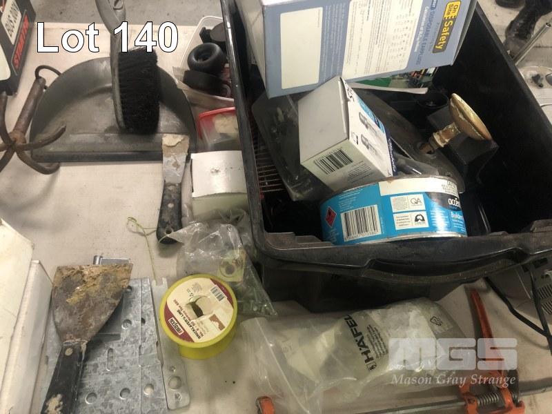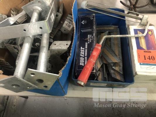 ASSORTED HARDWARE, PERGOLA BRACKETS, NAIL PLATES, NAILS, GALV PLATES, ASSORTED TOOLS & RADIO