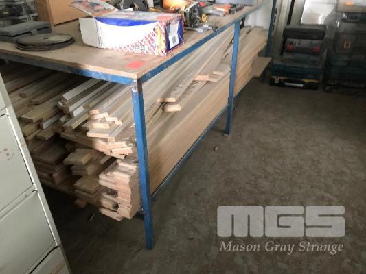 WORK BENCH, STEEL FRAME, PARTICLEBOARD TOP, 2400 x 1200mm & CONTENTS PARTICLEBOARD SHEETS