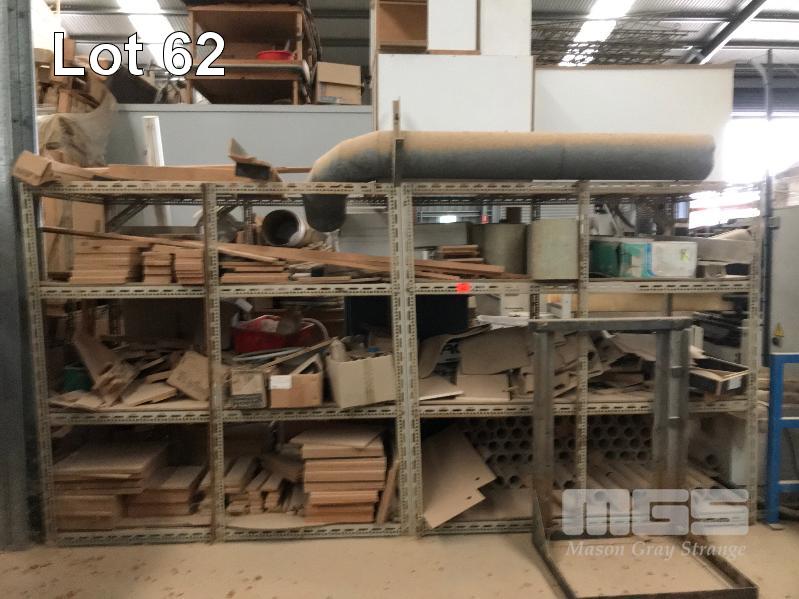 7 x BAY SLOTTED ANGLE IRON SHELVING & CONTENTS SUNDRY TIMBER COMPONENTS & EQUIPMENT