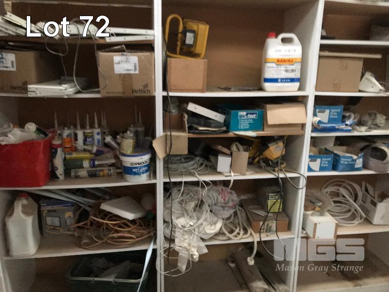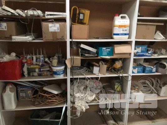 4 x BAYS STOCK SHELVING & CONTENTS ASSORTED HARDWARE & FITTINGS, SASH CLAMPS, ETC