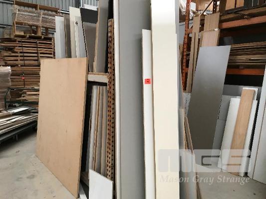 SINGLE BAY STOCK RACK, FLAT BED TROLLEY & CONTENTS PARTICLE BOARD & MDF SHEETS