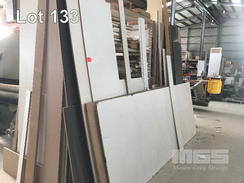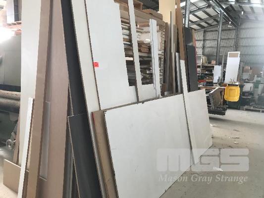 STEEL STOCK RACK & CONTENTS LAMINATE BOARD OFFCUTS, ETC