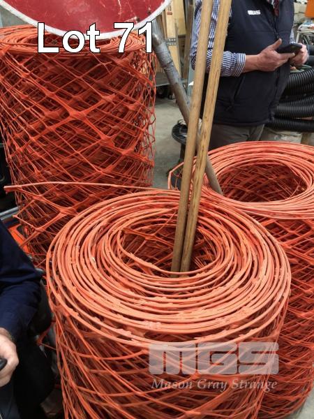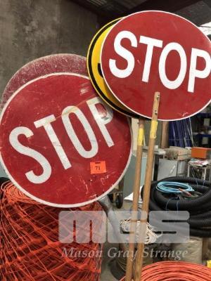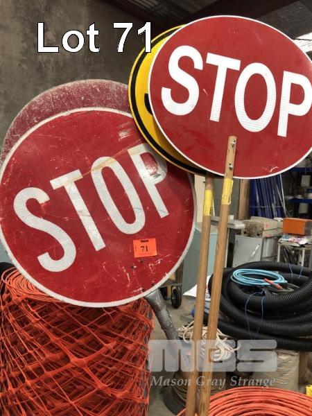 ASSORTED SAFETY BARRIERS & ROAD SIGNS, 4 x SLOW STOP LOLLIPOPS, 3 x ROLLS PLASTIC SAFETY FENCING, 5 x FOLD OUT ROAD SIGNS