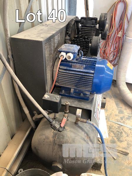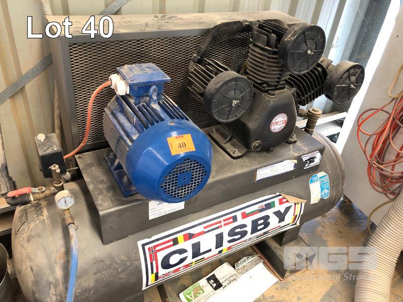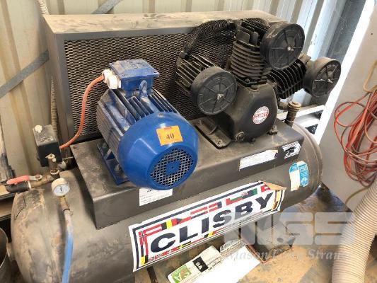 CLISBY AIR COMPRESSOR, 3 CYLINDER, 7.5kw, APPROX 30cfm, TANK SIZE 1200 x 450mm, 415v WITH AIR HOSE & DUST GUN