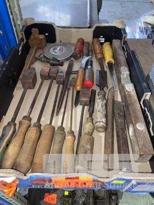 ASSORTED TOOLS INCLUDING SOLDER IRONS, SAW,S CHISELS, RABONE CHESTERMAN TAPE MEASURE, ETC, 1 x TRAY