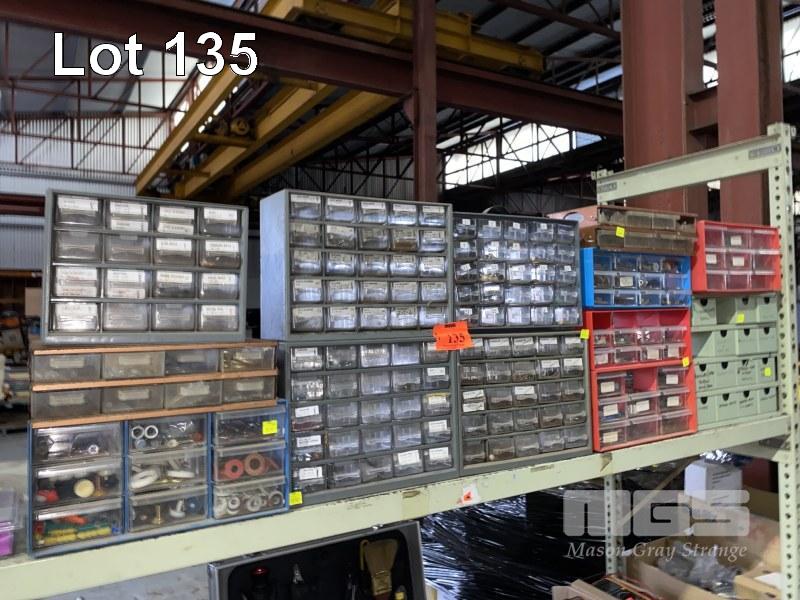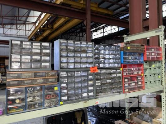13 x ASSORTED MULTI PARTS DRAWER UNITS & CONTENTS, FASTENERS, NAILS, ELEC CONNECTORS, NUTS & BOLTS, WASHERS, ETC