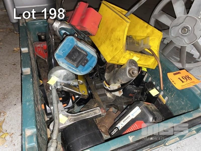 ASSORTED POWER TOOL BATTERIES, MAKITA DRIVER, AIR IMPACT GUN, GREASE GUN, DRIVER BITS, ETC, 1 x TUB