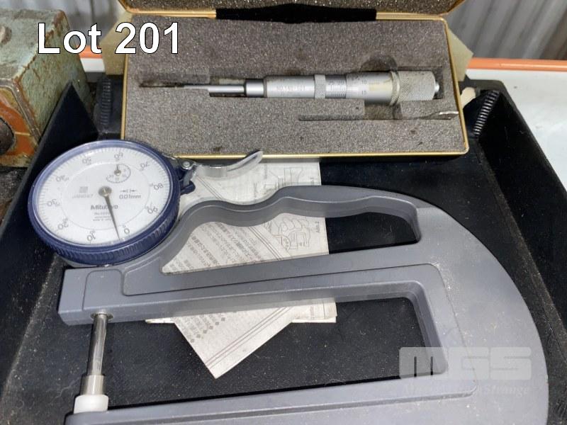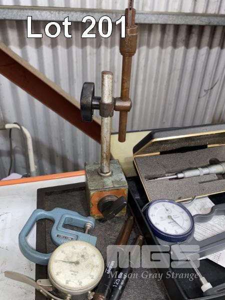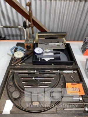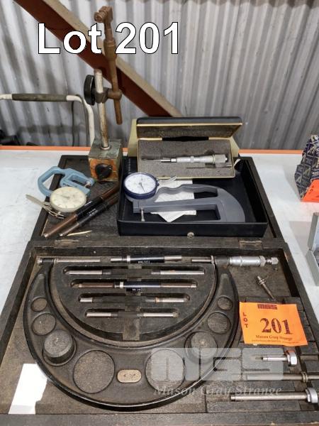 MOORE & WRIGHT MICROMETER, 4-8", MITUTOYO POST MIC, 0-25mm, 2 x THICKNESS MICS, MAGNETIC STAND, ETC