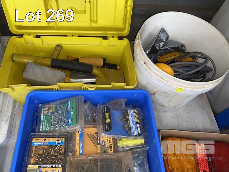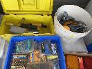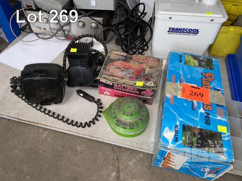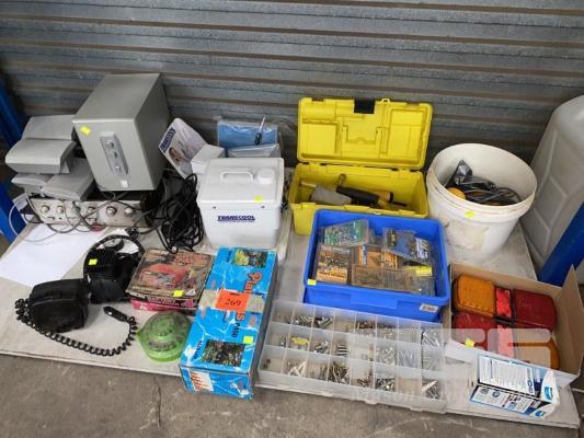 WATER PUMP, AIR PUMP, BATTERY CHARGER, TRANS COOLER, PARTS DRAWERS, & ASSORTED FIXTURES, CARPET TOOLS, AMP & SPEAKERS, 1 x SHELF
